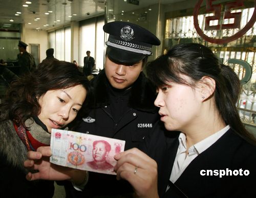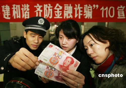 1月10日,北京110迎來第十三個宣傳日。北京崇文區(qū)警方向市民講解識別假幣的知識。中新社發(fā) 胡建強 攝