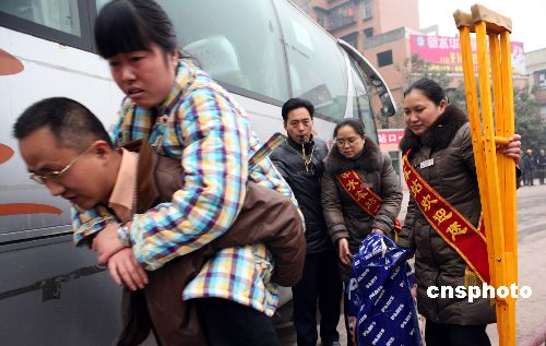2009年1月17日,四川廣安市鄰水汽車站的服務(wù)人員在熱情幫助病殘旅客上車。春運以來,四川廣安市各級客運部門以構(gòu)建和諧春運為宗旨,在細(xì)節(jié)和過程服務(wù)上下功夫,安排專門的工作人員在售票大廳、候車室及旅客上、下車區(qū)域主動為旅客提供服務(wù),深受旅客歡迎。中新社發(fā) 邱海鷹 攝