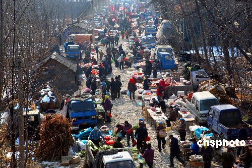 進(jìn)入農(nóng)歷臘月,中國(guó)山東一些農(nóng)村集市逐步紅火,特別是春節(jié)臨近,山村集市上車水馬龍,一派“清明上河圖”景象。中新社發(fā) 宋吉河 攝