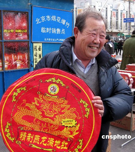 2009年1月20日,在京城馬連道煙花爆竹銷售網(wǎng)點(diǎn),人們?cè)谫?gòu)買煙花爆竹。今年北京五環(huán)內(nèi)614家臨時(shí)銷售網(wǎng)點(diǎn)向市民供應(yīng)煙花爆竹,花炮品種比2008年多了不少,而且價(jià)格也降低了10%左右,還增加了奧運(yùn)系列產(chǎn)品。中新社發(fā) 馬毅行 攝