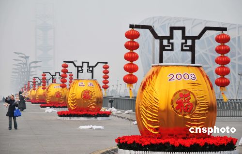 2009年1月21日,北京奧林匹克公園中軸線兩側安置的眾多巨型落地燈籠為即將到來的牛年春節(jié)增添了濃濃的喜慶氣氛,也吸引了眾多游客拍照留念。中新社發(fā) 樊甲山 攝