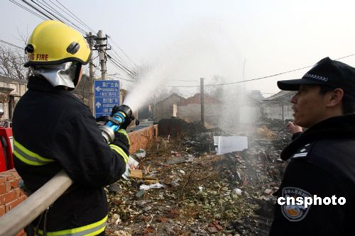 連日,北京遇大風(fēng)降溫天氣。為確保春節(jié)期間燃放煙花爆竹等消防安全,近日,北京崇文警方會同消防部門清理市民居住區(qū)內(nèi)各樓道及房前屋后的可燃物,拆除在消防通道上搭建的違章建筑,并派出消防車專門對前門地區(qū)重點(diǎn)部位、火災(zāi)隱患較為嚴(yán)重的院落實(shí)行人工降雨,確保春節(jié)期間消防安全。中新社發(fā) 胡建強(qiáng) 攝