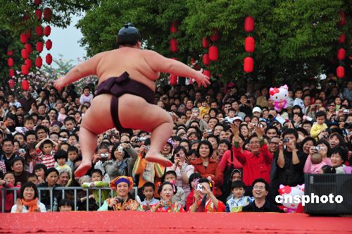 2009年2月1日,日本相撲手為廣大游客表演。第二屆廣州(番禺)櫻花文化節(jié)自1月26日在大夫山森林公園開(kāi)幕以來(lái),每天吸引數(shù)萬(wàn)游人;顒(dòng)除了有姹紫嫣紅的櫻花觀賞外,還有豐富多彩的表演。本屆櫻花文化節(jié)將于3月15日閉幕,歷時(shí)49天。中新社發(fā) 盤石 攝