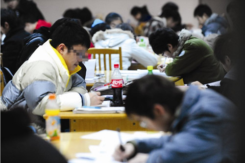 接連兩日,記者在該館自習室看到,眾多學子在伏案“奮筆疾書”,走近前去,才發(fā)覺他們大都是在專心致志地抄襲作業(yè),有的對著一張復印的政治試卷猛抄,有的摁著一本練習冊狂抄……從年齡看,以中學生居多,也有不少小學生。