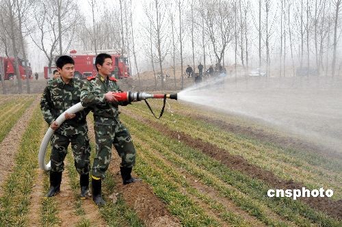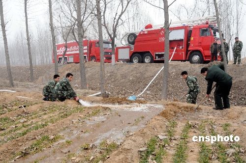 2月6日,河南省濮陽市公安消防支隊官兵把消防車輛開進高新區(qū)皇甫路辦事處后皇甫村田間地頭,為貧困家庭澆灌麥田。去年冬季以來,濮陽市降雨稀少,旱情十分嚴重。在抓好執(zhí)勤備戰(zhàn)的同時,濮陽消防官兵積極參與抗旱澆麥,受到群眾的歡迎。中新社發(fā) 劉敬寬 攝