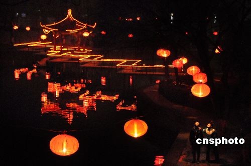 2月7日晚在山東省棗莊市山亭區(qū)太清湖公園內(nèi)拍攝的元宵燈海。連日來(lái),山東省棗莊市山亭區(qū)太清湖公園內(nèi)張燈結(jié)彩,喜迎元宵佳節(jié)。夜幕下的湖中倒影璀璨繽紛,整個(gè)公園仿佛燈的海洋。中新社發(fā) 李宗憲 攝