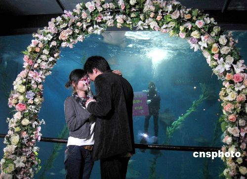 2月14日情人節(jié),上海一名女孩在神秘的“海洋世界”前瑰麗的彩花門下接受男友求婚后,相擁盡享甜蜜時光。上海海洋世界在情人節(jié)為申城情侶開啟愛情的夢幻大門,在海洋水族館巨大玻璃前設(shè)立花門,有情人紛紛在此情定終生,讓神奇的“海洋世界”為他們見證愛情。中新社發(fā) 陳靜 攝