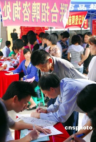 2009年2月16日,海南省就業(yè)局聯(lián)合大型零售企業(yè),在?、三亞、澄邁等全省8個(gè)市縣同時(shí)舉行針對弱勢群體的大型現(xiàn)場招聘會(huì),專門招收下崗職工、失業(yè)人員、零就業(yè)家庭人員、大中專畢業(yè)待業(yè)青年和農(nóng)民工。用人單位對聘用人員一律進(jìn)行培訓(xùn)上崗,無論哪個(gè)工種的工資,都不低于所在市縣的最低生活保障金,且到崗就給購買各項(xiàng)保險(xiǎn)。中新社發(fā) 善平 攝
