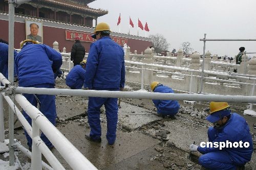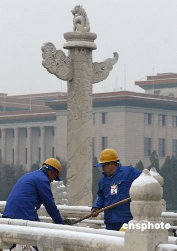 2009年2月18日,為迎接新中國(guó)成立60周年,天安門管委會(huì)開(kāi)始對(duì)金水橋?qū)嵤┍Wo(hù)修繕工作,工程擬于2009年5月1日前完工,并整體對(duì)外開(kāi)放。據(jù)悉,此次修繕工作將分階段進(jìn)行,由于施工圍擋防火板高度有限,因此金水橋和天安門城樓的整體景觀和游覽不會(huì)受到太大影響。中新社發(fā) 魯谷 攝