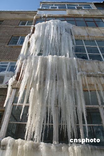 2月22日,在新疆阿勒泰市團結(jié)南路一居民樓上驚現(xiàn)壯觀的冰瀑奇觀,家住此樓的宋正國等四戶居民身受其擾。居民樓共四層冰瀑一直從三樓垂到一樓,十分壯觀。中新社發(fā) 唐曉波 攝