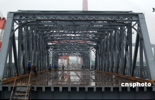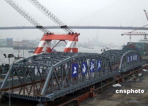 2月24日,上海百年外白渡橋在民生路碼頭接受最后“治療”。該橋2008年4月為配合上海外灘地區(qū)交通綜合改造工程而移橋修繕,經(jīng)過近一年的修繕,將于25、26日兩天分北、南兩跨橋身分別移回蘇州河,重新“上崗”后有望繼續(xù)提供服務(wù)50年以上。中新社發(fā) 鄭瑩瑩 攝