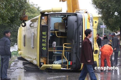 2月24日,上海金山區(qū)金山衛(wèi)鎮(zhèn)秦彎路上,一輛承載多名乘客的公交車(chē)不慎沖入河道內(nèi),大批乘客被河水淹沒(méi)。乘客和司機(jī)迅速展開(kāi)自救行動(dòng),最終全部脫離險(xiǎn)境。圖為發(fā)生事故的公交車(chē)被打撈上岸,車(chē)窗玻璃破損嚴(yán)重,吊車(chē)、警車(chē)正在現(xiàn)場(chǎng)進(jìn)行牽引工作。據(jù)了解,事故可能與金張衛(wèi)支線公交車(chē)車(chē)速過(guò)快、避讓不及有關(guān)。中新社發(fā) 滬選 攝