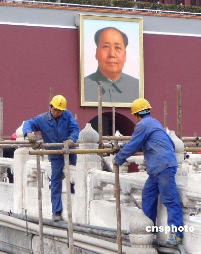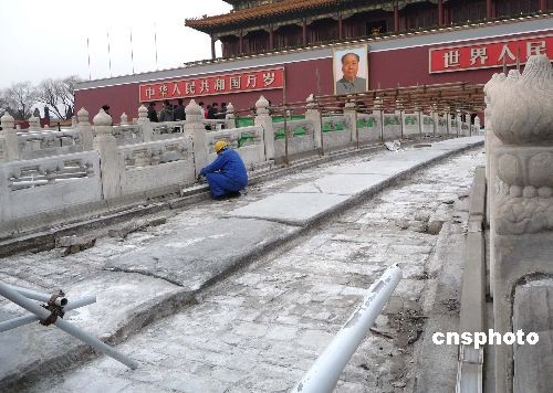 2009年2月26日,北京天安門金水橋上的施工人員正在搭建絞手架,為搭設(shè)圍擋及橋面鋪設(shè)青磚的工作做準備。據(jù)悉,天安門金水橋修繕工程將全部剔除品級橋混凝土罩面,恢復傳統(tǒng)青磚。同時,在橋上架設(shè)棧道,棧道將滿鋪木板,能夠承受游人活動等所產(chǎn)生的荷載強度等。 中新社發(fā) 玉龍 攝