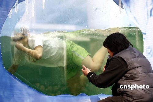 2月28日,“紅牛勇闖南北極”大型探險勇士招募活動開始在新春的北京舉行,應(yīng)募市民在活動中挑戰(zhàn)在冰水中憋氣。在北京站招募比賽中順利闖過三關(guān)、表現(xiàn)優(yōu)異者,將有機(jī)會前往北極極點探險!凹t牛勇闖南北極”大型探險勇士招募活動將在全中國海選出14位挑戰(zhàn)者,送往中國內(nèi)蒙古沙漠、瑞士阿爾卑斯冰川、挪威薩米人居住區(qū)等極地訓(xùn)練營展開集訓(xùn),最終會有3人獲得挑戰(zhàn)北極點的最后通行證。而南極探險選拔活動將在下半年進(jìn)行。中新社發(fā) 盛佳鵬 攝