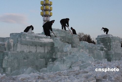 2月28日,施工人員在牡丹江市城區(qū)冰堡旅游景點(diǎn)拆除融化的冰雕作品!傲⒋骸边^后,素有“雪城”之稱的黑龍江省牡丹江市氣溫回升較快,城區(qū)內(nèi)的各大冰雪旅游景點(diǎn)的冰雪作品開始融化,失去寒冬里的風(fēng)采。從當(dāng)日起,城區(qū)冰雪旅游景點(diǎn)管理部門對(duì)融化的冰雕作品進(jìn)行拆除。中新社發(fā) 莊文斌 攝