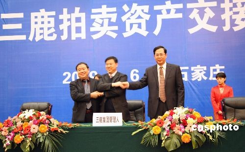 3月6日,石家莊三鹿集團管理人李愛民與北京三元集團董事長張福平、河北三元總經理高青山,在河北省石家莊亞太大酒店進行了拍賣資產交接協(xié)議簽署儀式。圖為簽約儀式結束后,三人微笑握手。中新社發(fā) 翟羽佳 攝