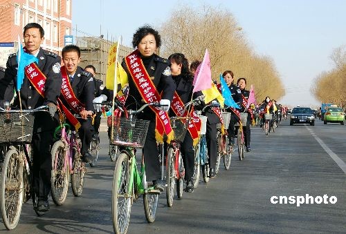 3月6日,甘肅張掖各界婦女代表近千人參加“保護濕地”環(huán)境保護主題宣傳日活動。圖為婦女自行車隊沿街宣傳。 中新社發(fā) 羅易祥 攝