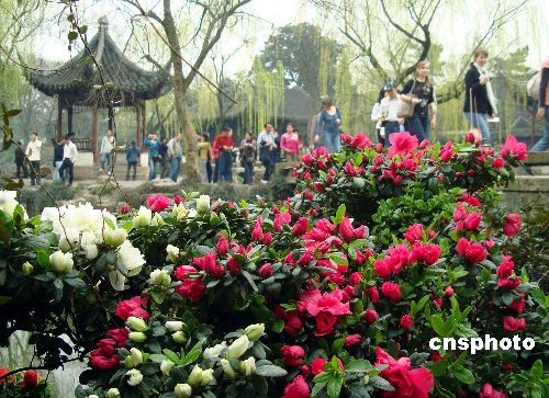 3月18日,蘇州拙政園盛開的鮮花吸引游人。陽(yáng)春三月,姹紫嫣紅的杜鵑花把蘇州古典園林拙政園變成花的海洋,吸引了眾多觀景的中外游客。中新社發(fā) 王建康 攝