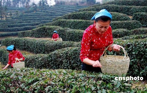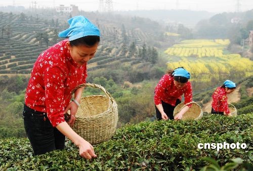 3月19日,廬山云霧茶各生產(chǎn)基地開始采摘新茶。這也意味著品質(zhì)最好的廬山云霧茶新茶“明前茶”將開始進(jìn)入市場(chǎng)。廬山云霧茶因日照霧薰,其味清香異常,經(jīng)久不散,是中國(guó)有名的特種茶,以“味醇、色秀、香馨、液清”而久負(fù)盛名,連續(xù)兩屆獲中國(guó)國(guó)際茶業(yè)博覽會(huì)金獎(jiǎng)。中新社發(fā) 胡國(guó)林 攝