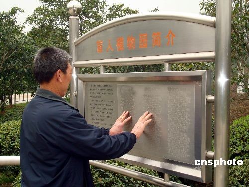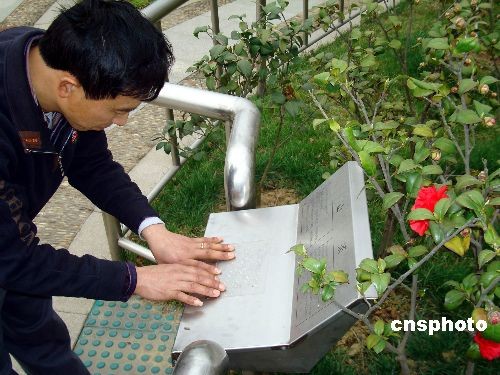 2009年3月19日,盲人在蘇州盲人植物園內(nèi)“手讀”盲文植物介紹。陽春三月,春暖花開,一些盲人來到蘇州盲人植物園踏青“賞”花。蘇州盲人植物園占地面積12000多平方米,有60多種觀賞植物。每種花草樹木前都有盲文寫的植物介紹,還配有語音輔助系統(tǒng),只要盲人一觸摸,就會(huì)有相應(yīng)的語音服務(wù)為盲人介紹相關(guān)植物知識(shí)。中新社發(fā) 王建康 攝