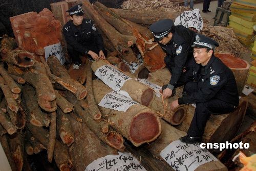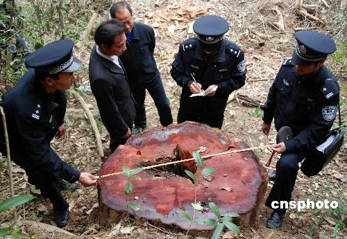 3月20日,江西省婺源縣森林公安局民警在案發(fā)現(xiàn)場對砍伐后的紅豆杉進行偵察。紅豆杉是國家一級重點保護野生植物。經(jīng)鑒定,被盜的一株蔸部直徑為1.07米,活立木蓄積7.494立方米,樹齡為670年以上;另一株蔸部直徑為0.88米,活立木蓄積4.310立方米,樹齡為550年以上,總蓄積量達11.804立方米。目前,紅豆杉已經(jīng)全部追回,14名犯罪嫌疑人員全部到案歸捕,目前此案正在進一步審理當(dāng)中。 中新社發(fā) 王國紅 攝