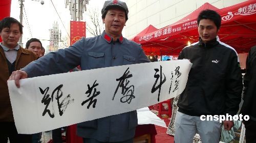 3月22日,幾位市民正在用手機(jī)給特型演員楊立達(dá)拍照。當(dāng)日,受安徽省亳州市一家企業(yè)邀請,長相酷似偉人毛澤東的特型演員楊立達(dá)在市區(qū)剛露面,就被許多市民團(tuán)團(tuán)圍著,并紛紛與他合影留念,楊立達(dá)還現(xiàn)場為市民揮毫潑墨,贈(zèng)送書法作品。中新社發(fā) 劉勤利 攝