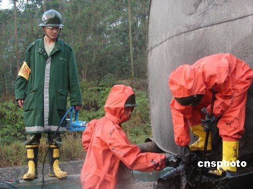 3月23日清晨,廣西南北高速公路那麗出口處,一輛運載蔬菜的貨車與一輛裝載瀝青的槽車追尾,造成貨車上3人被困,槽車上大量瀝青泄漏,流向當(dāng)?shù)匾伙嬘盟唇印=?jīng)過欽州消防人員3個小時的艱辛奮戰(zhàn),瀝青終于被成功堵截,未流入河中。中新社發(fā) 田華松 攝