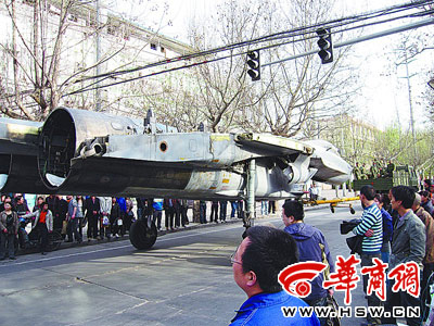 昨日(24日)下午5時許,一架被卸掉雙翼、沒有機頭的戰(zhàn)機,被一輛卡車拖著從西安火車東站拉出來,引起好奇市民的圍觀。飛機途經(jīng)路段,圍觀人群擠滿了馬路。