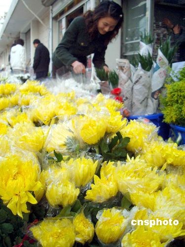 3月24日,顧客在蘇州市養(yǎng)育巷一家花店選購(gòu)祭祀菊花。隨著清明節(jié)的臨近,蘇州鮮花市場(chǎng)上菊花、百合等花卉熱銷,不少蘇州市民選擇用鮮花替代元寶蠟燭祭奠親人,樹(shù)立文明祭拜新風(fēng)。中新社發(fā) 王建康 攝