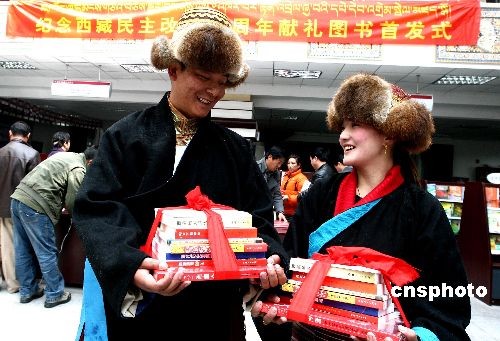 3月25日,紀(jì)念西藏民主改革50周年獻(xiàn)禮圖書首發(fā)式在拉薩舉行。藏漢文版大型畫冊《西藏今昔》、全彩版圖書《雪域邊線行》、藏文版《西藏民主改革50年》等圖書在具有歷史重大意義的時候為讀者獻(xiàn)上一份厚禮。中新社發(fā) 杜洋 攝
