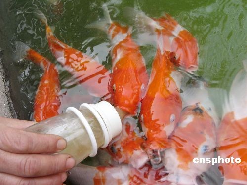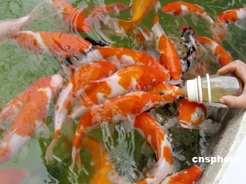 3月25日,在湖北宜昌公園,用奶瓶進(jìn)食的“吃奶魚”引來許多市民圍觀。該魚是原產(chǎn)日本的錦鯉,壽命在百歲以上,奶瓶裝的是高檔飼料。中新社發(fā) 韓玉洪 攝