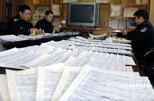 北京豐臺警方經(jīng)縝密偵查,近日一舉將一個(gè)用電話進(jìn)行詐騙的特大犯罪團(tuán)伙打掉,15名嫌犯全部落網(wǎng)。警員正在整理該團(tuán)伙從網(wǎng)上購買的個(gè)人信息。中新社發(fā) 楊陽 攝