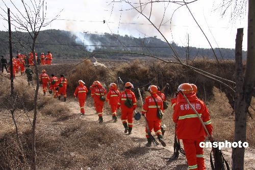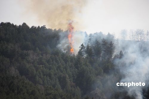 2009年3月28日下午2時(shí)左右,山西省盂縣東梁鄉(xiāng)東梁村騎龍山發(fā)生森林火災(zāi)。 森林火災(zāi)發(fā)生后,當(dāng)?shù)卣、公安、林業(yè)、醫(yī)務(wù)等部門第一時(shí)間趕到現(xiàn)場,組織滅火,并啟動(dòng)了相關(guān)應(yīng)急預(yù)案。當(dāng)?shù)爻鰟?dòng)數(shù)百名干部群眾撲火,陽泉市武警也趕赴現(xiàn)場增援。由于火勢兇猛,在附近的村莊都能聽到火燒山林的聲音,山火的灰塵甚至飄到了最近的溫家山村。截至發(fā)稿時(shí),沒有人員傷亡報(bào)告。中新社發(fā) 程瑜 攝