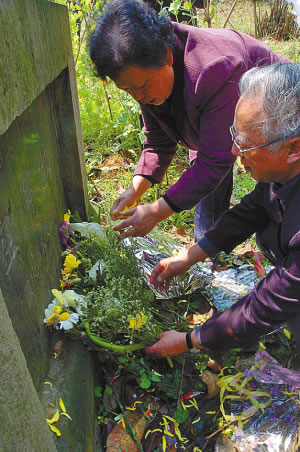 昨日,南山空軍墳。黃漢儒的兒子黃慶林、女兒黃慶蘭到空軍墳祭奠父親。陳浮 攝