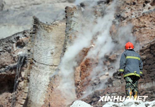 目前,救援工作仍在進(jìn)行中。由于石灰窯窯口前的臺(tái)地面積很小,且有一條大裂縫,消防車(chē)一時(shí)難以駛?cè);消防人員用高壓水槍作業(yè)時(shí),水一噴上去窯體即不斷塌方,救援難度較大。
