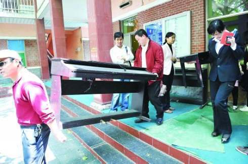 中午12點(diǎn)左右,部分家長(zhǎng)開(kāi)始把教室里的設(shè)施往外搬。幾位家長(zhǎng)把數(shù)碼鋼琴房里的一架電子鋼琴搬出了教室!斑@個(gè)教室里原來(lái)有9架鋼琴,現(xiàn)在還剩7架,這一架是我占的!币晃50歲上下的女士對(duì)記者說(shuō),“我覺(jué)得復(fù)課是不大可能了,要求退錢又找不到領(lǐng)導(dǎo),只好搬點(diǎn)東西作抵押了!