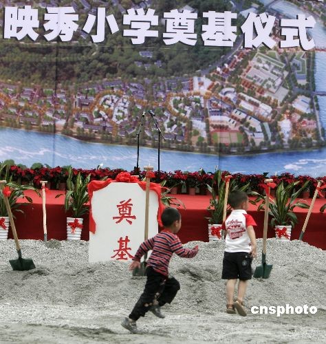 5月11日,四川省汶川縣映秀鎮(zhèn)災(zāi)后恢復(fù)重建項(xiàng)目開工暨映秀小學(xué)新校舍奠基儀式舉行。映秀小學(xué)在地震中校舍徹底倒塌,孩子們在板房上課至今。新校舍由深圳證監(jiān)局捐建,用地10446平方米,其中綠地面積大于35%,總投資2951.6萬元,擬建6層,可容納12個(gè)班,學(xué)校運(yùn)動(dòng)場作為臨時(shí)避災(zāi)場地。預(yù)計(jì)工期5個(gè)月。 同期開工的還有包括映秀幼兒園、中灘堡大道、漁子溪大橋和映秀鎮(zhèn)安居房等映秀鎮(zhèn)災(zāi)后恢復(fù)重建項(xiàng)目。中新社發(fā) 張曉理 攝