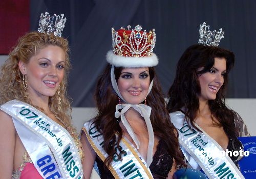 10月15日晚上,2007年國際小姐選美大賽決賽在日本東京舉行,六十一位佳麗參加角逐。經(jīng)過民族服裝、泳裝和晚禮服等項(xiàng)目激烈的競爭,最終2007年國際小姐由墨西哥小姐Priscilla Perales獲得,亞軍由希臘小姐Despoina Vlepaki獲得,而季軍則由白俄羅斯小姐Yuliya Iindzeyeva摘取。來自中國香港的香港小姐王君馨獲得2007國際友誼小姐的獎項(xiàng)。中新社發(fā) 滕劍峰 攝