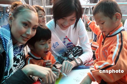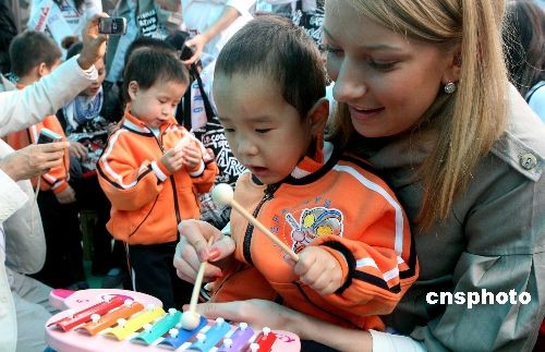 圖為來自臺灣的模特選手黃安潔在兒童福利院教兒童寫字。