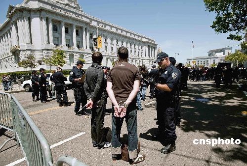 當(dāng)?shù)貢r(shí)間5月26日,美國(guó)加州最高法院宣布,維持去年十一月四日加州選民通過(guò)的禁止同性戀者結(jié)婚的八號(hào)提案。法院同時(shí)裁決,十一月四日前領(lǐng)取結(jié)婚證書(shū)的一萬(wàn)八千余對(duì)同性戀者婚姻合法。最高法院的裁決引起同性戀支持者的強(qiáng)烈不滿,他們?cè)谑懈髲B前的十字路口靜坐示威,阻擋交通長(zhǎng)達(dá)數(shù)小時(shí),警方最后逮捕了一百五十余人。中新社發(fā) 陳鋼 攝