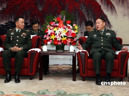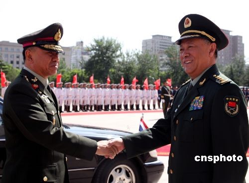5月18日下午,國(guó)務(wù)委員兼國(guó)防部長(zhǎng)梁光烈上將和中國(guó)人民解放軍總參謀長(zhǎng)陳炳德上將,分別在北京八一大樓會(huì)見(jiàn)來(lái)訪的泰國(guó)軍隊(duì)最高司令宋吉滴上將。宋吉滴一行是應(yīng)陳炳德上將的邀請(qǐng)來(lái)華進(jìn)行為期四天的訪問(wèn)的。中新社發(fā) 宋吉河 攝