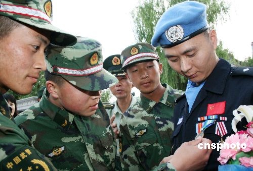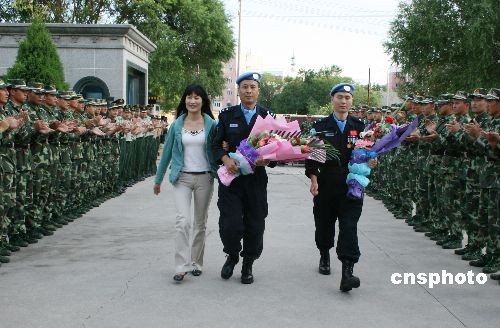 6月17日,出色完成海地維和使命的中國(guó)第七支赴海地維和警察防暴隊(duì)成員、新疆博爾塔拉蒙古自治州公安某部警官楊良、崔繼偉和李強(qiáng)載譽(yù)歸來(lái),受到了社會(huì)各界的熱烈歡迎。該防暴隊(duì)由新疆公安邊防總隊(duì)獨(dú)立組建,于2008年8月代表中國(guó)政府、中國(guó)警察遠(yuǎn)征海地,圓滿(mǎn)完成為期10個(gè)月的聯(lián)合國(guó)海地任務(wù)區(qū)維和任務(wù)。中新社發(fā) 杜偉 攝