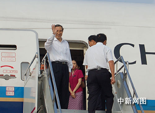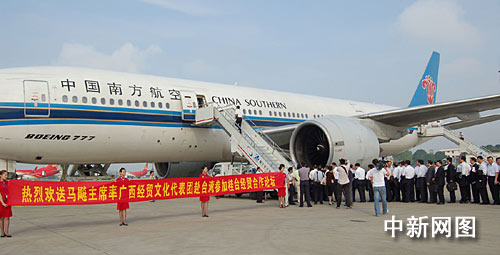 5月21日上午,廣西壯族自治區(qū)主席馬飚率領(lǐng)廣西經(jīng)貿(mào)文化代表團(tuán)乘坐包機從廣西南寧機場起飛,開始飛赴臺灣,廣西由此成為中國大陸各省、自治區(qū)、直轄市中第一個由省長級官員率團(tuán)赴臺進(jìn)行經(jīng)貿(mào)文化交流的省份,此行也成為海峽兩岸交流史上的新突破。 馬飚率團(tuán)此行赴臺是參加“兩岸產(chǎn)業(yè)高峰會議——2009年桂臺經(jīng)貿(mào)合作論壇”,廣西經(jīng)貿(mào)文化代表團(tuán)人數(shù)多達(dá)1000余人,這也是大陸赴臺人數(shù)最多的參訪團(tuán)。劉萬強 攝