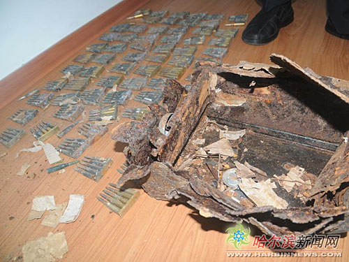 21日下午3時許,平房區(qū)(哈爾濱)平房鎮(zhèn)工農(nóng)村一位農(nóng)民在大地里發(fā)現(xiàn)了一個裝滿子彈的鐵箱子,他隨即報警。接到報警后,平房公安分局治安大隊趕到現(xiàn)場,經(jīng)查點(diǎn),箱子里面共有300多發(fā)銹跡斑斑的子彈。由于包裝子彈的紙上寫有日文,警方推測,子彈應(yīng)該是日偽時期留下的機(jī)槍子彈。據(jù)悉,這些子彈將被警方帶回分局等待統(tǒng)一銷毀。(陳南)