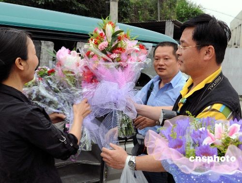 5月27日傍晚,在福州定點場所解除醫(yī)學觀察后,兩名福建省首例輸入性甲型H1N1流感確診患兒同機接觸者接受親友(左一)贈送的鮮花。當日,福建省衛(wèi)生廳在其網(wǎng)站上發(fā)布福建省甲型H1N1流感防控信息通報,截止5月26日24:00,衛(wèi)生部通報福建省首例輸入性甲型H1N1流感確診患兒病情進一步好轉(zhuǎn),無咳嗽及流涕,無并發(fā)癥,精神狀態(tài)良好,體溫正常,已連續(xù)3天體溫低于37℃。根據(jù)專家組的意見,該患兒同機的30名在閩密切接觸者隔離醫(yī)學觀察期限為5月27日20時。屆時密切接觸者如無特殊情況,即按期解除醫(yī)學觀察;純河H屬及就診過程中的8名密切接觸者將按其與患兒脫離接觸的時間起算,隔離滿7日后,陸續(xù)解除醫(yī)學觀察。中新社發(fā) 劉可耕 攝
