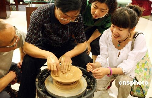 5月28日,中國傳統(tǒng)端午節(jié)之際,來自中國龍泉的青瓷陶藝大師在北京合璧興陶瓷藝術(shù)館舉行“最具有潛力的中青年青瓷大師作品展”,陶藝大師徐定昌在現(xiàn)場與收藏愛好者交流,F(xiàn)代浙江龍泉青瓷自2008年中國嘉德秋季藝術(shù)品拍賣會首次登場,2009年春季拍賣會四位大師作品將聯(lián)袂登臺,是次作品展專門展售同毛正聰大師一起來京參拍的徐定昌、陳愛明、盧偉孫三位大師的作品。中新社發(fā) 錢興強 攝