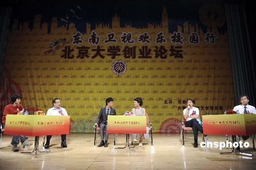 6月2日,北京大學(xué)創(chuàng)業(yè)論壇在北京大學(xué)舉辦,皇明太陽能董事長黃鳴、七匹狼董事長周少雄、福建汽車工業(yè)協(xié)會會長凌玉章、3G門戶網(wǎng)總裁張向東,與北京大學(xué)的同學(xué)們共享創(chuàng)業(yè)經(jīng)驗。該論壇由東南衛(wèi)視和共青團北京大學(xué)委員會共同主辦。中新社發(fā) 廖攀 攝