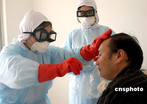 寧強(qiáng)縣疾控中心流行病學(xué)調(diào)查人員向"疑似甲型H1N1流感病人"進(jìn)行鼻試子和咽試子采樣檢查。