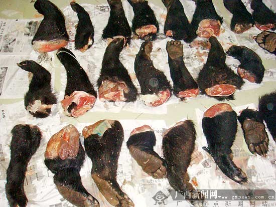 6月7日,廣西警方破獲一起特大走私案。一犯罪團(tuán)伙以運(yùn)廢紙的名義,將173只熊掌及其他走私物品運(yùn)至防城港市時(shí),被警方抓獲。