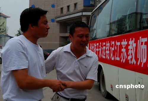 6月16日中午,綿竹地震災(zāi)區(qū)最后一批52名江蘇幫扶支教老師圓滿完成為期131天的支教任務(wù),離開綿竹踏上歸途。綿竹社會各界群眾和學(xué)生組成的軍樂隊(duì)前來為他們送行。據(jù)悉,地震后,江蘇省先后派遣了110名中小學(xué)骨干教師前往綿竹災(zāi)區(qū)各中小學(xué)擔(dān)負(fù)支教任務(wù)。中新社發(fā) 胥輝 攝